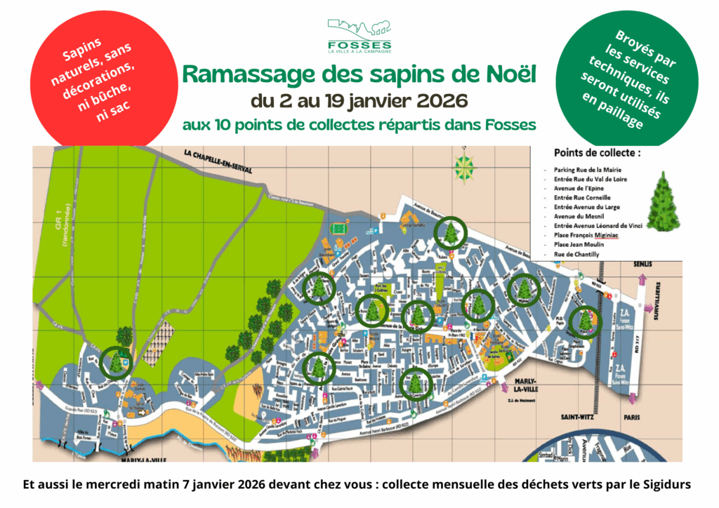 - Du 2 au 19 janvier 2026, vous trouverez à Fosses 10 emplacements réservés aux sapins qui ont bien rempli leur mission de décoration festive. Ils seront ramassés par les services techniques de la ville, puis broyés et réutilisés en paillage dans les espaces verts.
